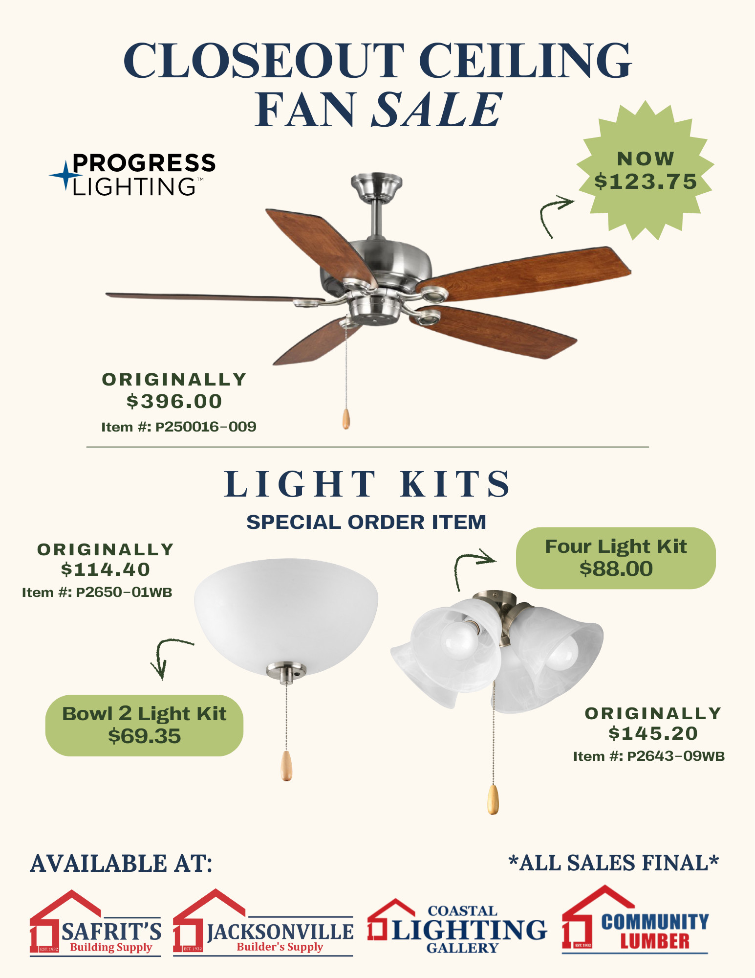 Our closeout Progress Lighting ceiling fans deliver reliability, timeless design, and unmatched value — plus optional light kits to elevate the finish.
